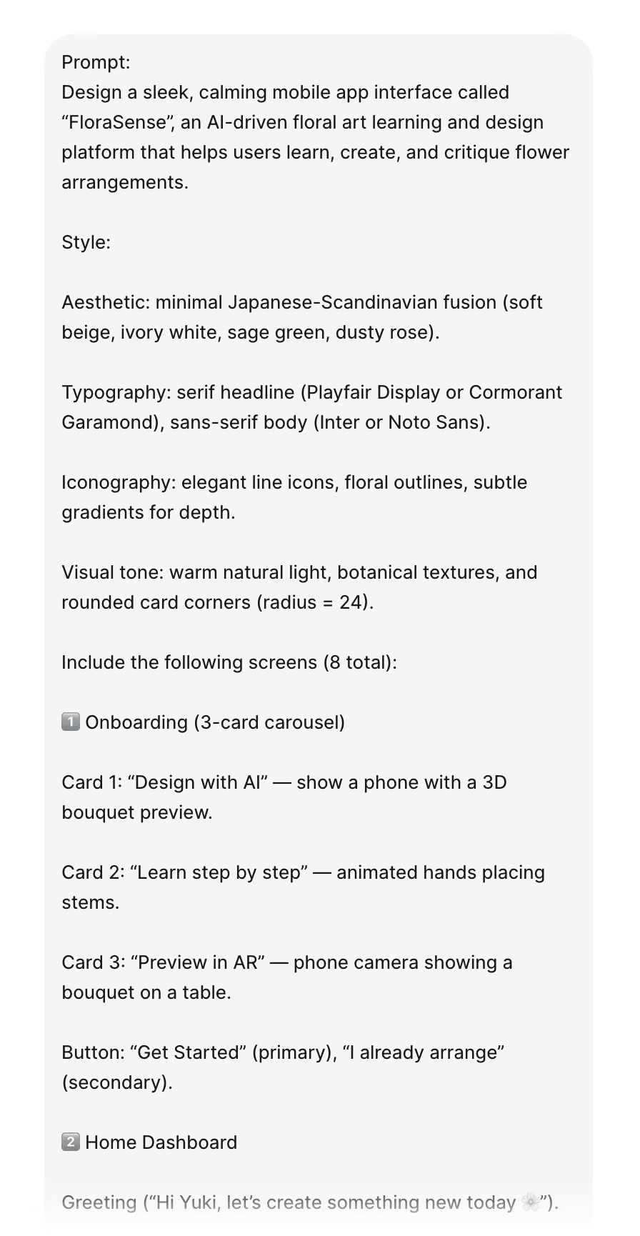 After sketching core features and mapping key user flows, I transitioned from low-fidelity wireframes to interactive screens using AI-assisted prototyping tools. I used Figma Make to translate hand-drawn sketches into structured layouts and functional components, allowing the initial system vision of FloraSense to take form quickly. This approach enabled rapid iteration on interaction logic, prompt pacing, and screen transitions, helping validate the overall flow before refining visual and experiential details.